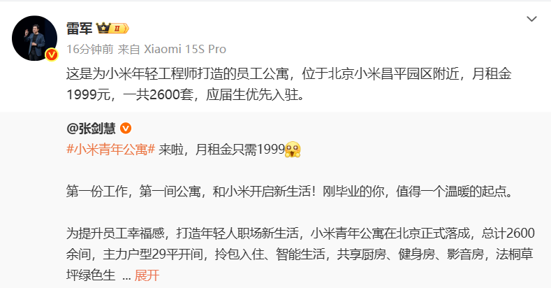 7月1日,雷军官方微博发文称小米为年轻工程师打造员工公寓,位于北京小米昌平园区附近,月租金1999元,一共2600套,应届生优先入驻。