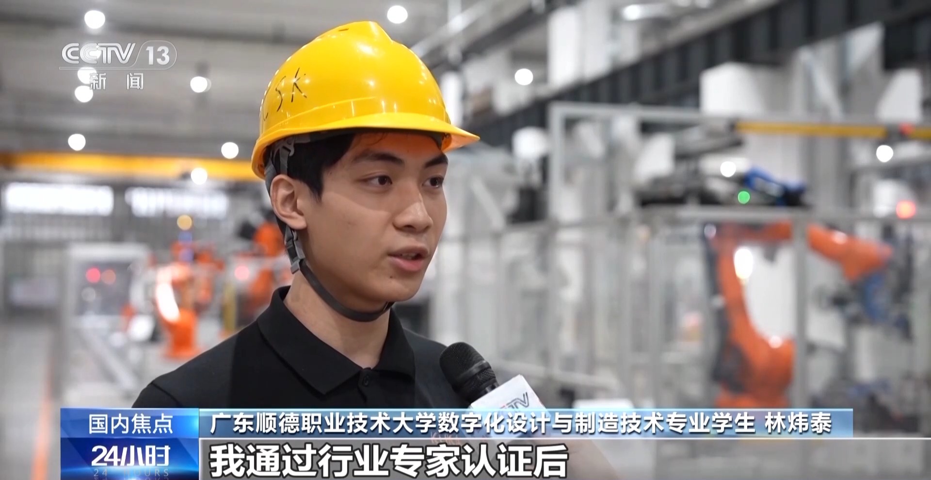 广东顺德职业技术大学数字化设计与制造技术专业学生 林炜泰:学习效率很高,我通过行业专家认证后,就直接来到公司这个产线机器人编程岗进行实习,我现在每个月的实习工资是4000元左右。
