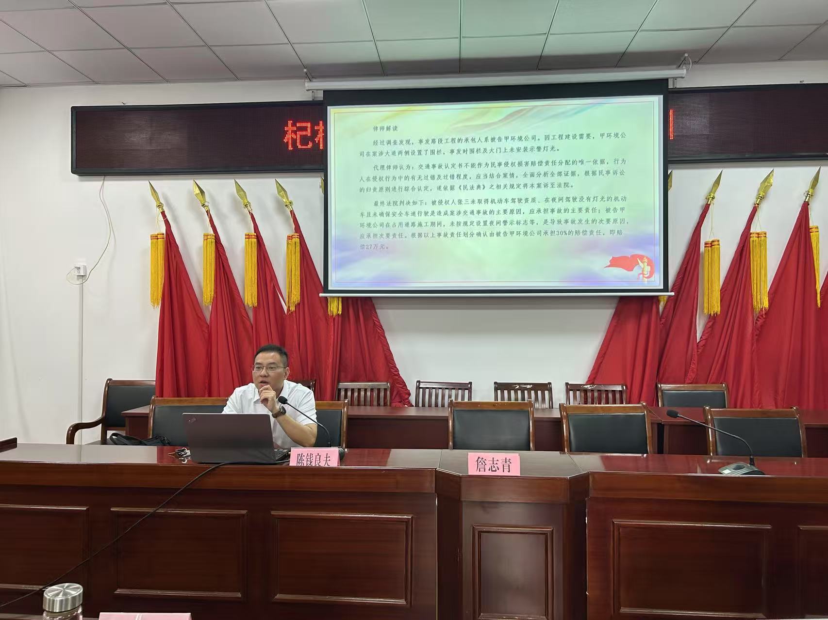 授课内容围绕基层工作实际,由陈钱良夫律师进行专题授课。内容重点聚焦:1.基层常见法律实务解析:剖析基层治理中高频出现的法律问题及应对策略。2.依法行政能力提升:阐述依法决策、规范执法、公正司法的实践要求与方法。3.群众工作中的法治运用:讲授如何在信访调解、政策宣讲、为民服务中有效运用法治思维和方法。4.廉洁履职与风险防范:解读法律法规对公职人员的要求,强化纪律意识和风险防控意识。