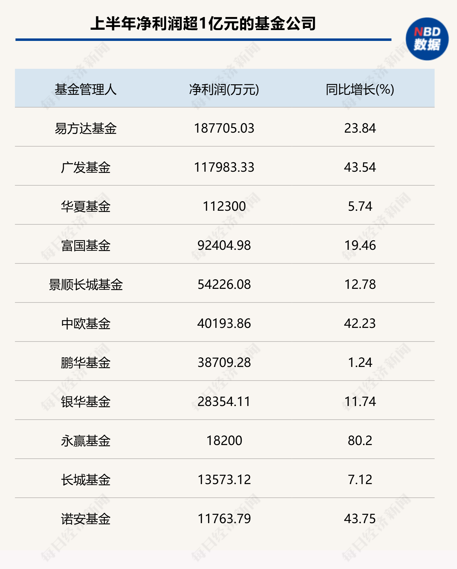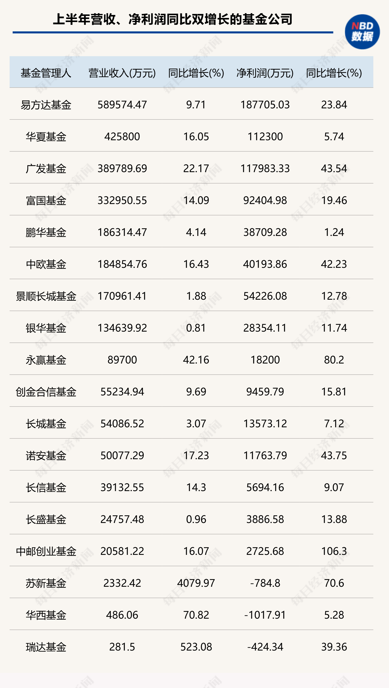 《每日经济新闻》记者注意到,也有部分营收在10亿元以上的基金公司保持了较高的增速,例如广发基金同比增长22.17%,中欧基金增长16.43%,上半年营收超42亿元的华夏基金也同比增长了16.05%。