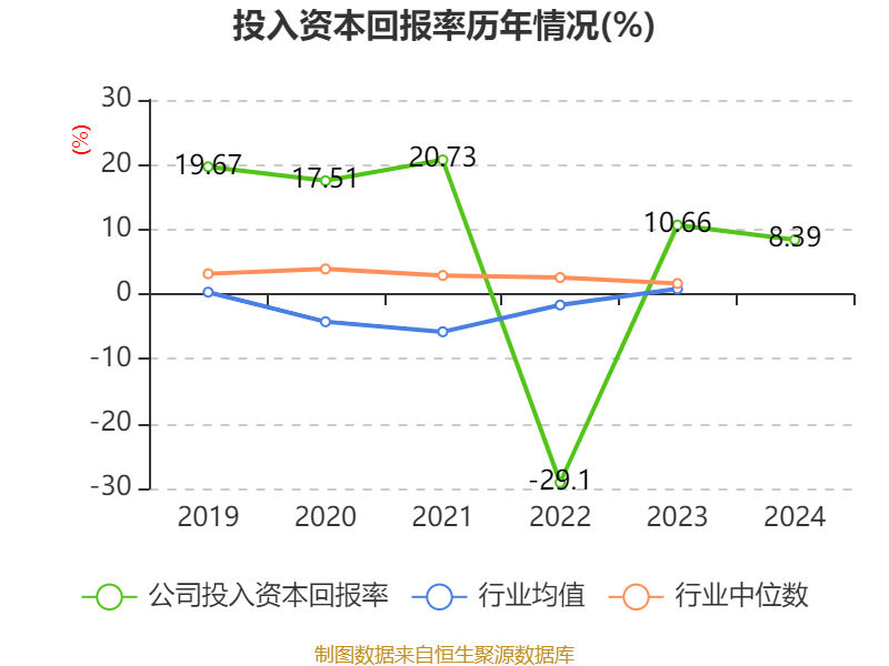 数据显示,2024年公司加权平均净资产收益率为9.64%,较上年同期下降3.25个百分点。公司2024年投入资本回报率为8.39%,较上年同期下降2.27个百分点。