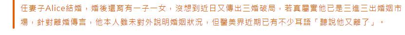 没想到近日又传三婚破局,若属实他已是三进三出婚姻市场。针对离婚传言,他本人虽未对外说明婚姻状况,但医美界近期已有不少耳语“听说他又离了”。