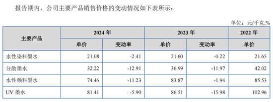 其中水性染料墨水从2022年的21.65元/千克降至2024年的21.08元/千克,下降幅度相对较小。而分散墨水作为公司第二大收入来源,其单价从2022年的41.02元/千克,降至2024年的32.22元/千克,降幅达到21.45%;还有水性颜料墨水单价从85.53元/千克降至74.46元/千克,UV墨水单价从102.96元/千克降至81.41元/千克,二者下滑幅度分别为12.94%、20.93%。